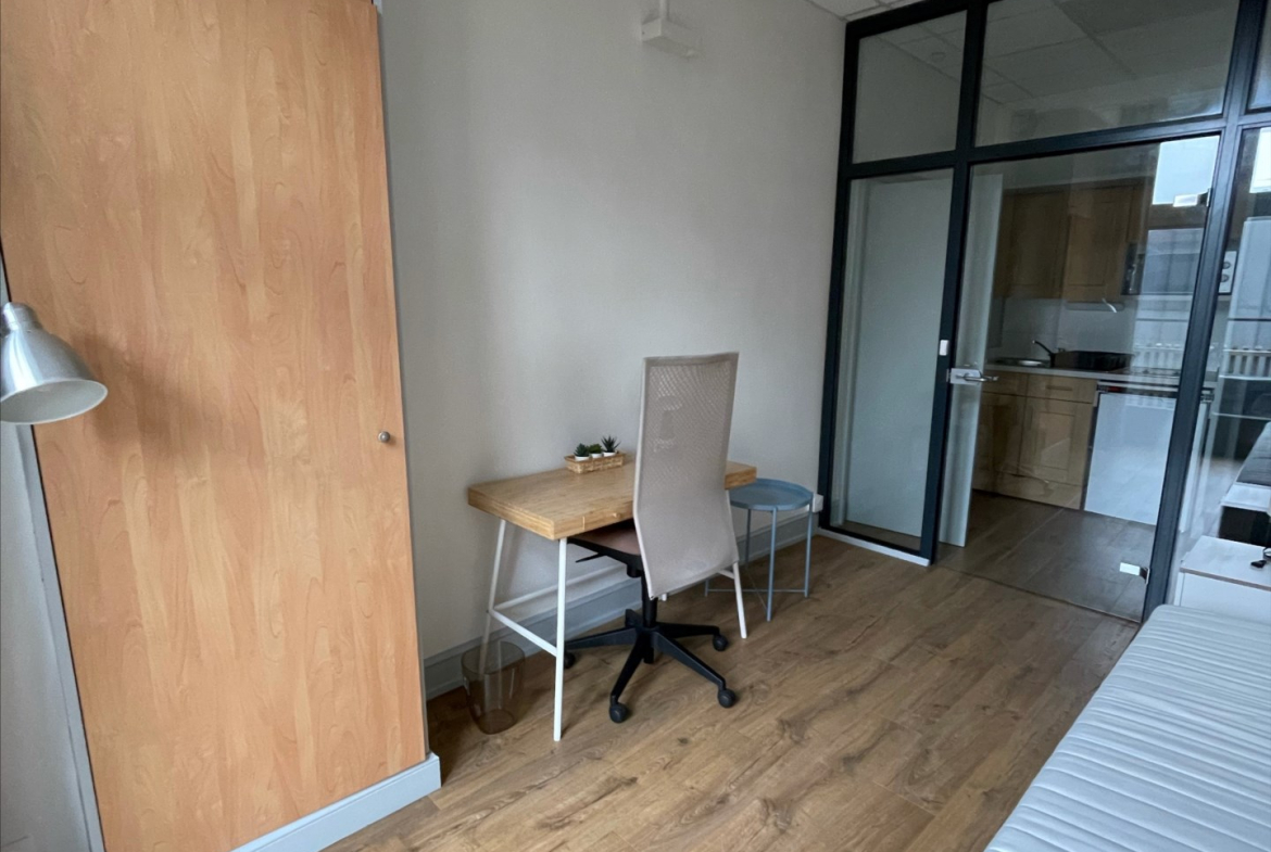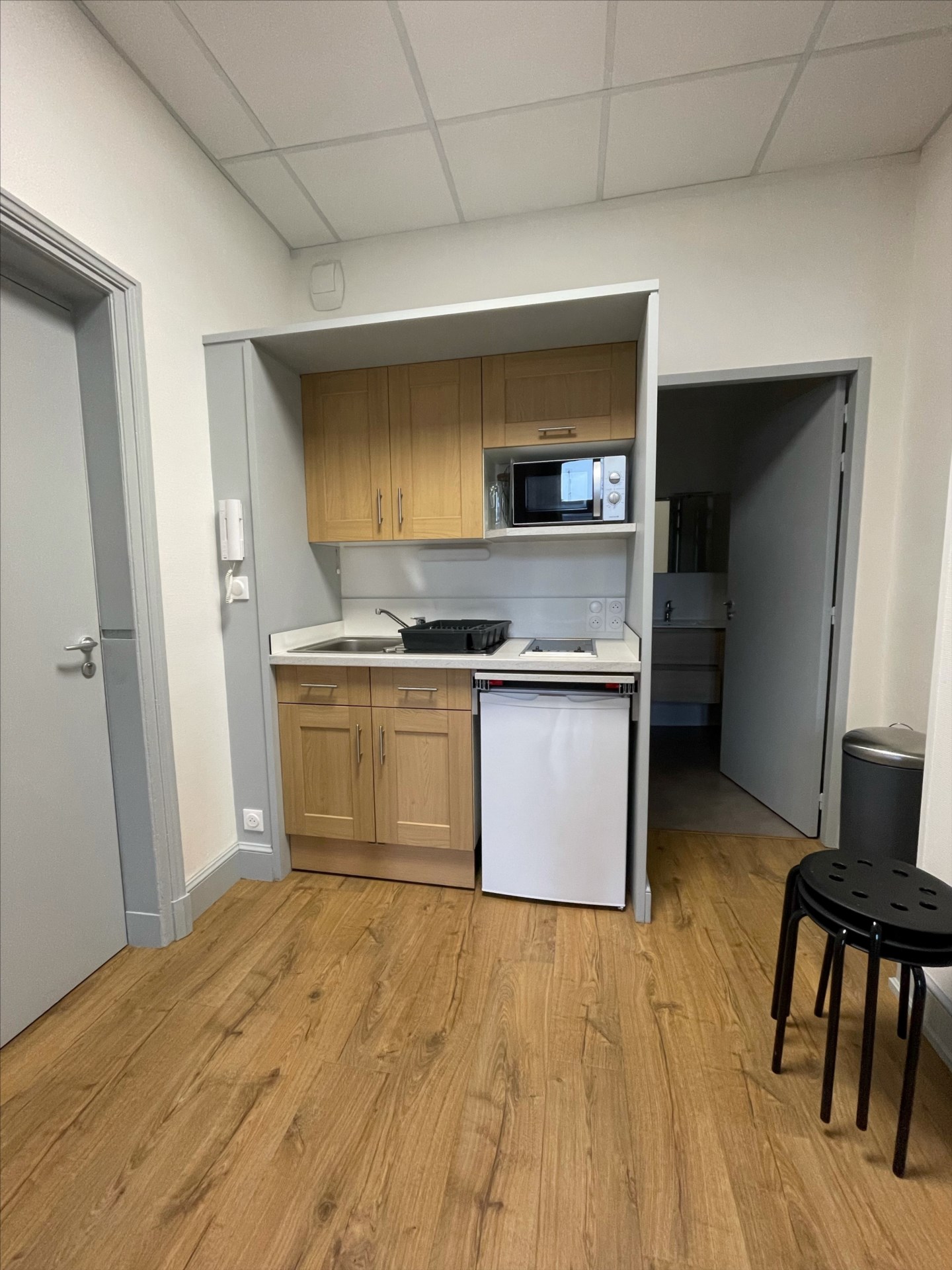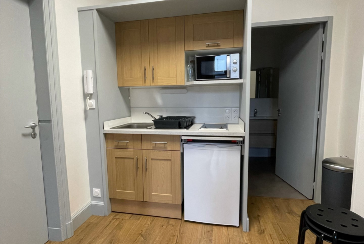 Ce bien comprend, une pièce de vie (lit, matelas, bureau, chaise et armoire) avec une kitchenette équipée (plaques de cuisson, réfrigérateur et meubles de rangements) et une salle de bain avec wc.